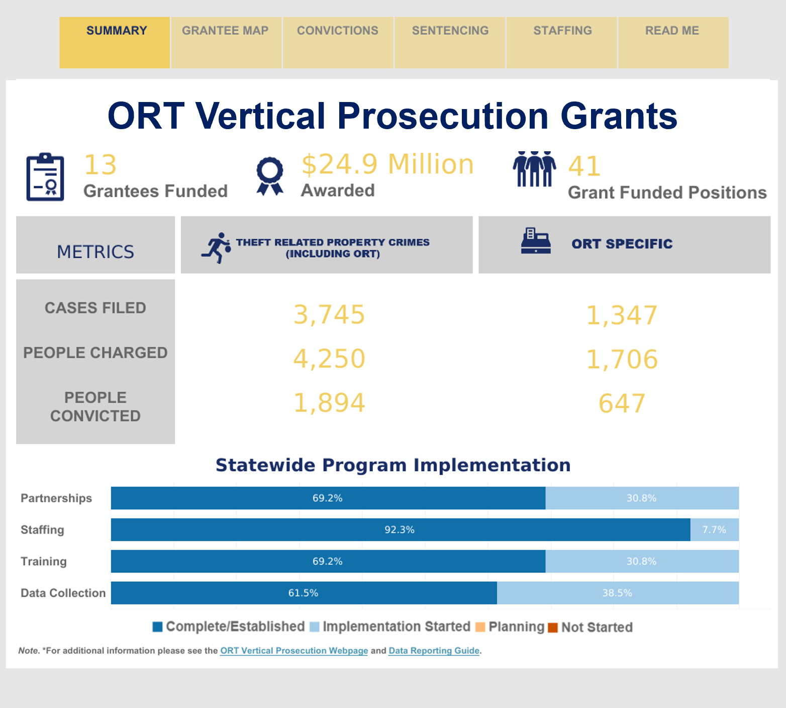 The ORT Vertical Prosecution Grant was established through Assembly Bill 178 and was also awarded through a competitive grant process for district attorneys to address increased levels of theft-related property crimes using a vertical prosecution model. The model allows for a streamlined approach that ensures prosecutors manage cases comprehensively (i.e., from arraignment to sentencing), providing continuity for victims and law enforcement.